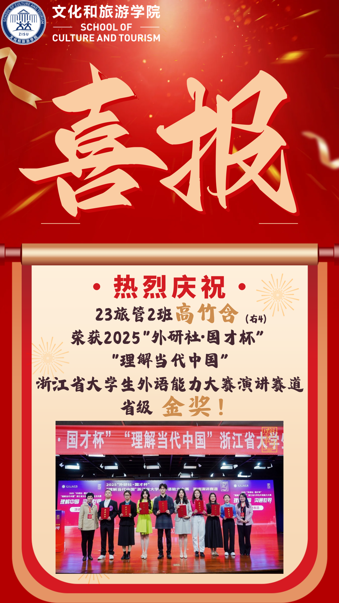 11月2日,2025“外研社·国才杯”“理解当代中国”浙江省大学生外语能力大赛演讲比赛省级决赛圆满落幕。经过与来自全省各大高校的优秀选手激烈角逐,我院23旅管2班学子高竹含凭借其地道的语言表达、深刻的思辨能力和沉稳大气的舞台风采,脱颖而出,一举夺得省级金奖,充分展现了我院学子卓越的外语综合素养与心系家国的时代担当。